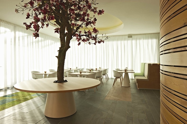 Het restaurant ontwerp speelt in op de behoeften voor de gasten en bezoekers door de gehele dag. ’s Ochtends is er een ontbijt buffet, M+R ontwierp speciale meubels waarbij het meubel volledig elektrisch te openen is zodat het dienst kan doen als buffet met speciale gekoelde presentatie en geïntegreerde verlichting. Het bovenblad is elektrisch te bedienen. Als het buffet gesloten is fungeert het meubel als hoge zitbar. Een grote ronde tafel in het midden met een tulp magnolia boom is zorgt voor extra opstelplaatsen van rolstoelen en rollators. Het restaurant is ingedeeld in zones, separaties met hoge banken, zodat er verschillende ruimten ontstaan.