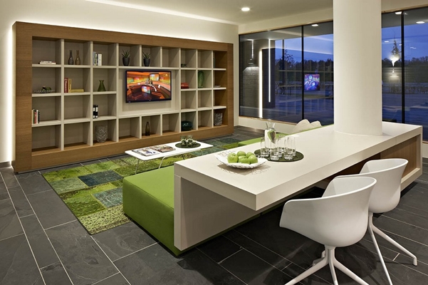 De entree met de receptie loopt naadloos over in de bar in het restaurant. In de foyer is een lange bank geplaatst met hoge stoelen en ruimte voor rolstoelers. Het restaurant is net als het gehele hotel uiterst rolstoel vriendelijk, qua ruimte, opstelplaatsen en zonder drempels onder dat dit afbreuk doet aan de verschijningsvorm. De receptie heeft een verlaagd deel en de inrichting is zodanig dat een rolstoeler overal kan gaan ‘zitten’.