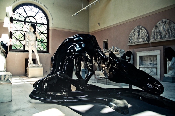 Maar Dark Horse is meer dan alleen een sculptuur. Het is ook een enscenering van de emotie ‘smart’. In de Gipsoteca van de ‘Istituto d’Arte di Porta Romana in Firenze’, waarin Dark Horse wordt getoond, zijn de hoofden van de kopieën van beroemde Toscaanse sculpturen bedekt met zwarte hoofddoeken. Rouwen ze ook? Of zijn ze simpelweg fundamentalistische moslims geworden? Volgend jaar zal buiten in de tuin de rouwtocht worden voortgezet. Twintig beelden van zwarte stof staan in een cirkel, midden in de tuin, rondom de rouwende bomen opgesteld. En zo is de cirkel gesloten: eerst liepen de paarden cirkels in deze zaal, nu lopen de zwarte ‘hengsten’ buiten in de tuin dezelfde cirkels.