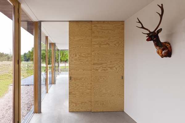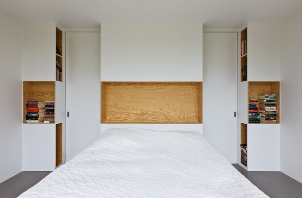 In order to bring nature inside even more, all of the interior functions in the house are made from natural materials. i29 interior architects created large surfaces of wood through the whole house to connect the different areas. Cabinets, wardrobes, walls, sliding doors, beds and even a fire place have been made in one and the same material. Pine wood panels -normally a basic material- has been used as a high end finishing with fine details.