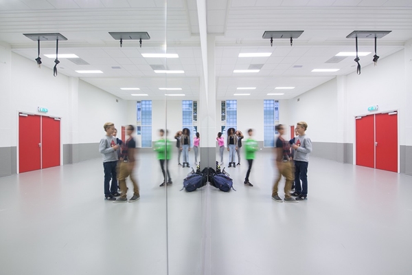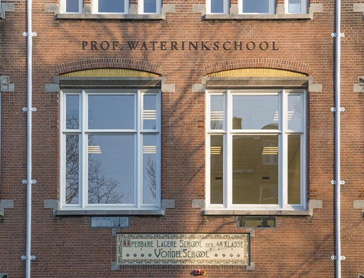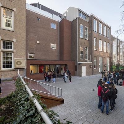 In het interieur is ruimte gewonnen op de zolder zodat deze nu bruikbaar is. De bestaande gymzaal is voorzien van een nieuwe vloer en de kleedkamers zijn vergroot. We hebben een lift toegevoegd om de juiste routing te verkrijgen. De voor de school belangrijke en herkenbare rode deuren zijn overal doorgevoerd. De school sluit hierdoor weer mooi aan bij de omliggende architectuur in de straat.