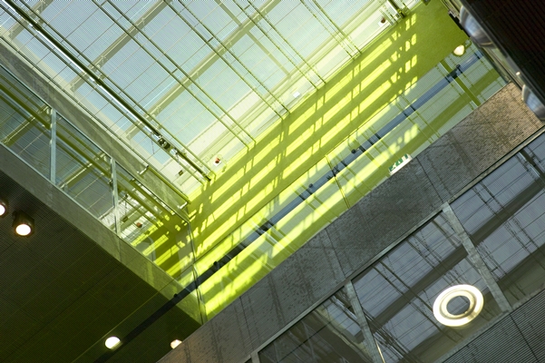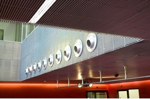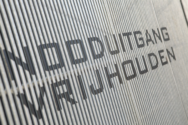 Vandaalbestendig interieur van roosterpanelen, horizontaal en verticaal toegepast, geïntegreerde functies zoals licht, lucht, sprinklers en videobewaking. Zie ook: