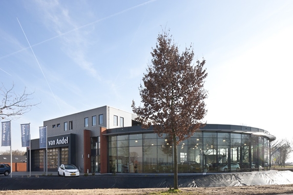 Voor Autobedrijf Van Andel is het ontwerp gemaakt voor een servicegarage met showroom gecombineerd met een bedrijfswoning.