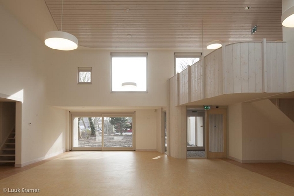 Centraal in het gebouw is een hoge gemeenschappelijke ruimte waar jaarfeesten gevierd kunnen worden en waar de groepen met elkaar de dag kunnen beginnen. In de afgeronde hoeken van het nieuwe gebouw bevinden zich de groepsruimten met aanliggende speelkamer, keuken, sanitair/ verzorgingsruimte en berging. Ook zijn er op de begane grond ruimten voor therapie. Op de verdieping zijn de kantoorruimten en ruimten voor personeel gerealiseerd.