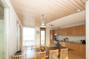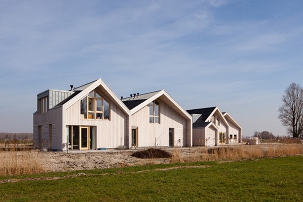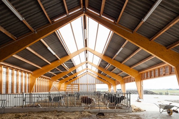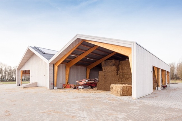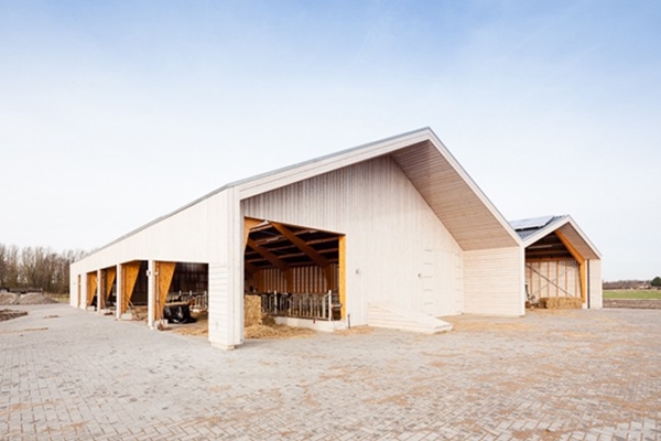 De verschillende gebouwen, woonhuis, zorghuis en stalgebouw, worden gedomineerd door transparant wit gebeitste geveldelen die deze verbinden tot één samenhangend geheel. Het stalgebouw is opgebouwd uit houten spanten van transparant afgewerkt inlands lariks, gelamineerd houten lariks kolommen, -liggers en -staanders waartegen ruw vuren geveldelen met latafdruk 22x146mm van PlatoHOUT. De woonhuizen hebben een stenen kern waartegen vuren houten stijl- en regelwerk, Kingspan Kooltherm isolatie en een waterkerende dampdoorlatende houtvezelisolatieplaat (Pavatex) is aangebracht. Op Plato regelwerk zijn de ruw vuren geveldelen met latafdruk 22x146mm van PlatoHOUT aangebracht. De geveldelen zijn afgewerkt met een transparant wit Sansin Enviro Stain SDF. Het dak is ambachtelijk in het werk gemaakt van een vuren houten dakconstructie met minerale wol isolatie, op de dakconstructie zijn waterkerende dampdoorlatende houtvezelisolatieplaten (Gutex) aangebracht. Verder zijn de volgende houttoepassingen toegepast: Accoya houten pergolaconstructie, Accoya houten buitenkozijnen en ramen, vuren houten binnenkozijnen, esdoorn gefineerde houten binnendeuren, vuren houten trappen, vuren houten plafonds transparant afgewerkt, vuren houten vensterbanken, vuren houten aftimmeringen, multiplex zichtkwaliteit binnenzijde dak & kapellen.