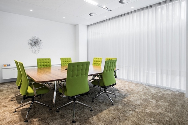 Daarnaast is er voor de sfeerbeleving in de vergaderruimtes gekozen om aanvullend gordijnen met wave-confectie toe te passen. deze versterken het decoratieve effect.