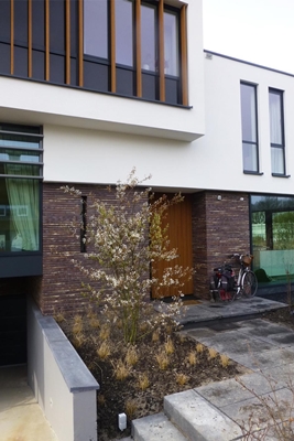 De gesloten volumes zijn bekleed met wit geïsoleerd stucwerk wat in contrast staat tot het zware metselwerk en houten latten. De materialen van het interieur, hout en grijze vloertegels, geven de woning een natuurlijke uitstraling.