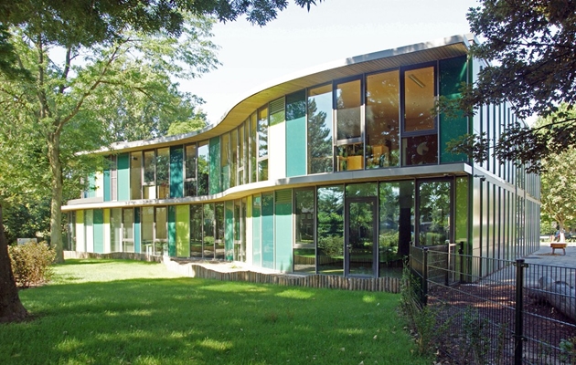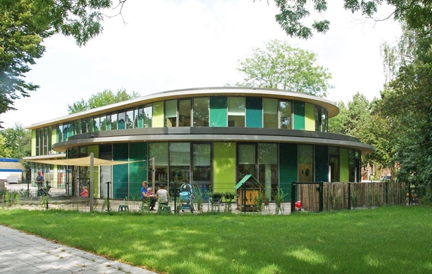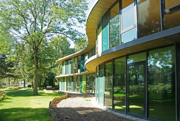 De Apollo11 bevindt zich op de kop van een lommerrijk en parkachtig terrein. Door de ronde vorm en slingerende luifel ontstaat het beeld van een ‘paviljoen’ tussen de bomen en kent het een alzijdige oriëntatie. Het gebouw is kleurrijk, transparant en uitnodigend van karakter.