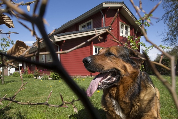 Ecologische logs woning, gebouwd in de Scandinavische traditie, waarbij de logs zich aan de buitenkant van de wand bevinden. De kruisverbinding blijft zichtbaar, maar vraagt meer onderhoud.