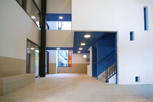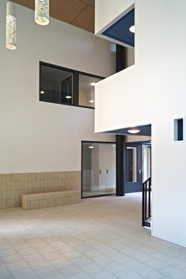 Vanaf de kant van de sportvelden blijft het bos zichtbaar, doordat de kruinen van de bomen boven de lagere bouwvolumes uit steken. Een hoge centrale poort maakt een openbare voetgangersroute door het complex mogelijk en geeft op straatniveau direct doorzicht naar het boomrijke deel van het plantsoen. De openbare looproute vormt tevens de ontsluiting van het complex met centraal op de route de poort en een openbaar plein. Aan dit plein zijn de hoofdentrees van de diverse gebouwdelen gesitueerd. Deze poort is tevens een openbaar verblijfsgebied, dat verlicht wordt door lichtvlakken in het plafond en de wanden.