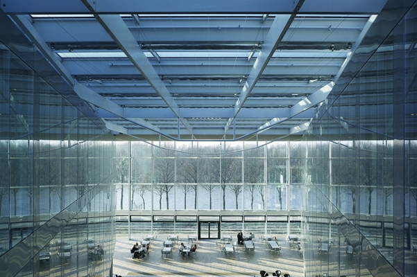 Renovatie: aluminium kozijnen, glas. Tweede huidfacade van PTFE Weefsel (Poly-Ned) of gelaagd glas