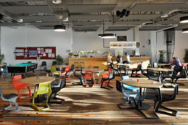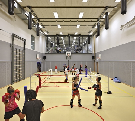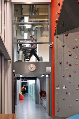 De openheid van de glazen gevel op de begane grond wordt doorgezet in het interieur. De “belle etage” is vormgegeven als een gevarieerd ‘landschap’ met in hoogte geleidelijk oplopende vloeren en glazen puien. Deze zorgen voor ruimtelijk overzicht en een karakter dat past bij de dynamiek van de functie. De toegepaste materialen in het gebouw zijn in aantal beperkt en hebben een natuurlijke uitstraling. De vloeren van antraciet rubber, de lichte houten sportvloeren en de witte en lichtgrijze wandafwerking maken een rustig geheel. De klimwand loopt door over alle verdiepingen en vormt zo een verbindend element en oriëntatiepunt in het gebouw. De wand is ook van buiten zichtbaar en sluit met zijn rode kleur aan bij de tinten van de gevel. In het café, waar een hergebruikte sportvloer met oude stukjes belijning ligt, worden kleuraccenten met de losse inrichting gemaakt. De naast het café gelegen hoge en lichte entreehal maakt met zijn open en vriendelijke sfeer dat iedereen zich welkom kan voelen.