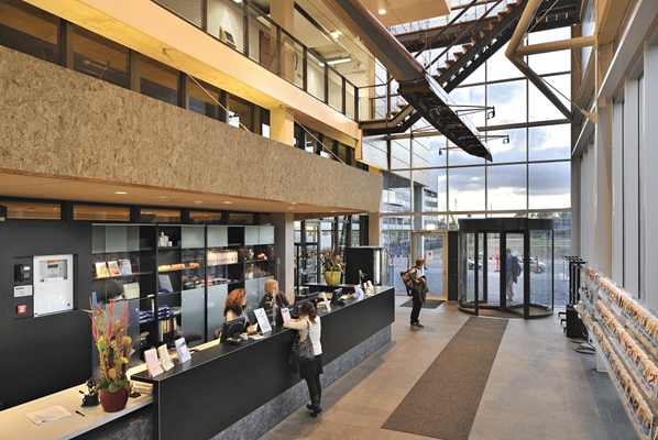 Het compacte gebouw vult de gehele kavel tussen twee poldercorridors (de brede, onbebouwde stroken voor groen en expeditie). Haaks hierop ontstaan langs beide zijden van het gebouw routes waaraan diverse sporten in de etalage staan. De entree in de zuidwest gevel ligt in de zichtlijn vanuit het nieuwe NS-station langs de 19e-eeuwse boerderij Anna Hoeve. Naast de entree, met optimaal zicht en zon, ligt iets verhoogd het ruime caféterras met daaronder de fietsenstalling. De opengewerkte noordgevel toont de enorme klimwand met daarvoor langs grote hangende trappen waarover bezoekers de verdiepingen kunnen bereiken. Door de meer gesloten sportzalen (multifunctioneel inzetbaar, bijvoorbeeld als zaal voor tentamens of evenementen) ‘op te tillen’ naar de 1e verdieping is op de begane grond en in het souterrain ruimte voor de meer open en intensief gebruikte programma’s als fitness en squash. Deze zijn daarmee ook voor grote bezoekersstromen snel bereikbaar.