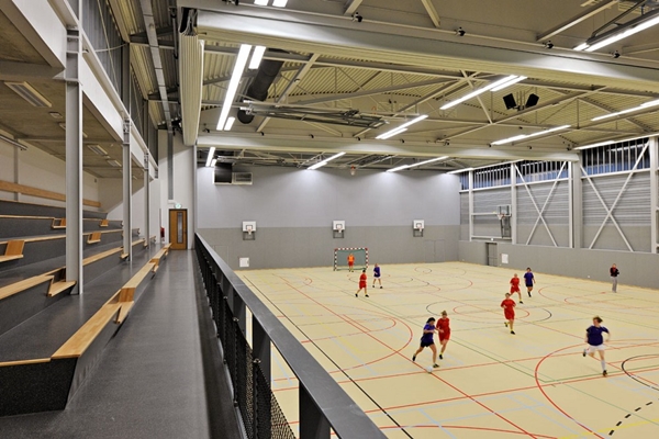 Deze stapeling van functies wordt ook zichtbaar in de horizontale geleding van het exterieur. In aansluiting op het maaiveld maken strokenramen in de plint de activiteiten in het souterrain zichtbaar. In de gevel van de verhoogde begane grond vloer zet een doorlopende glasstrook de extraverte functies en sporten in de etalage. Daarboven loopt rondom het gebouw een expressieve en kleurrijke ‘banderol’: een verbindend element waarvan begin en eind de entree markeren. Plint en ‘banderol’, bestaand uit kunststof gevelpanelen in vier verschillende tinten oranje, geven een warme, levendige en dynamische uitstraling, passend bij het karakter van een sportgebouw. Aan de zuidoostzijde komt langs de gevel een extra vluchttrap vanuit de sportzalen omlaag. De staven waaraan de trap is opgehangen fungeren tevens als afvoer voor het regenwater van het dak, dat naar een gebied met maaskeien wordt geleid. Dit doet dienst als regenwaterbuffer. Het ‘zwevende’ gebogen dak boven een translucente strook maakt de grote maat van de sportzalen op de verdieping zichtbaar.