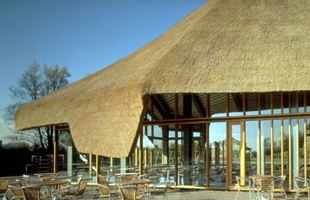 Het nieuwe entreegebied vormt een lineaire route het park in. Om deze lijn te versterken krijgt de entreeroute een duidelijke staart: de brug, en kop: het restaurant. De brug en de gebouwen vormen door hun vormentaal, materiaalgebruik en constructie een zogenaamde beeldfamilie. In de uitwerking van de gebouwen zijn de identiteit van de omgeving, de belevingswereld van kinderen en de relatie gebouw en natuur de voornaamste uitgangspunten. De gebouwen zijn in concept eenvoudig van opzet en verkrijgen hun identiteit door de expressieve dakvormen. Dit resulteert in een rechthoekige glazen doos, voor een maximale relatie binnen-buiten, met daarover een gevouwen bedekking van riet, een organische huid die beschermt en zich identificeert met zijn omgeving, de luxe villa’s met hun rieten kappen.