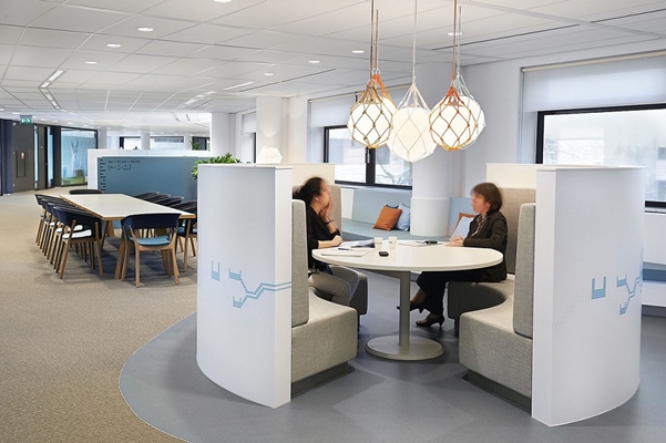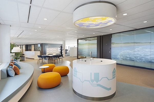 Het Duin & Water van Dunea zijn de leidraad geweest voor het interieur ontwerp. De specifieke kenmerken van deze landschappen zijn vertaalt in het interieur ontwerp. De duinzone aan de buitenzijde van het maanvormige gebouw is meer besloten en de waterzones, aan de binnenzijde zijn meer open. Door middel van fotografie van natuur fotograaf Bart van Engeldorp op de glaswanden, tentoonstellingsruimtes en een Waterbar op elke verdieping is de identiteit van Dunea in het interieurontwerp ingebed. De renovatie van het pand in Zoetermeer is i.s.m. OIII en Graziosi Progetti gerealiseerd.