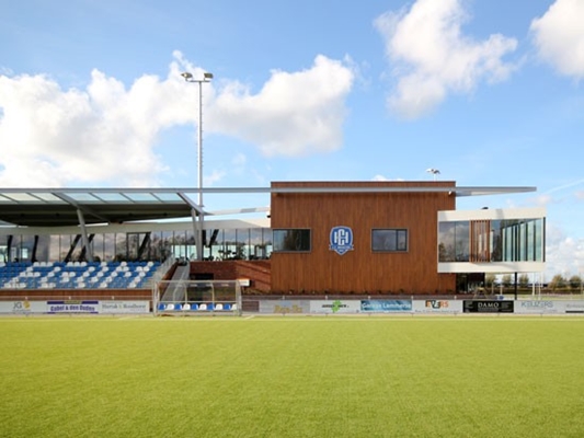 Het gebouw is ontworpen als een compositie van afleesbare onderdelen die één krachtig geheel vormen. Het maakt het gebouw herkenbaar en geeft het een duidelijke identiteit. De plint van het gebouw, waar zich in hoofdzaak kleedkamers bevinden, is robuust vormgegeven. De tribune is in het midden van het hoofdveld geplaatst en wordt als het ware ‘omarmd’ door de kleedkamers. Dit geeft de tribune een beschutte ligging. De zichtlijnen vanaf de tribune vormen uitsneden in de hoofdmassa. Ze zorgen voor het karakteristieke en herkenbare beeld van schuine lijnen. De kantine van de vereniging bevindt zich op de verdieping. Deze is opgevat als één transparante ruimte met uitzicht naar alle velden. De overige functies, als vergaderruimte, bestuurskamer, keuken, berging en sponsorruimte cq sport BSO zijn als gesloten blokjes in de transparante ruimte geplaatst. Ze zijn als het ware de identiteitsdragers. De plaatsing van deze blokjes is zorgvuldig, zodanig dat er in de transparante ruimte gezellige zithoekjes ontstaan. Deze zithoekjes variëren van intiem en rustig tot ruim en feestelijk. De verdieping kent geen gangen waardoor alle ruimte ten gunste komt aan de kantine. De architectonische uitstraling van het gebouw wordt gecomplementeerd met een nadrukkelijk aanwezige glazen luifel die over de tribune hangt. De materialisatie volgt het concept. Een robuuste plint in metselwerk met aardetinten, daarboven een transparante ruimte met een vliesgevel. De vliesgevel heeft verticale accenten in hout ter plaatse van de te openen ramen. Het geheel wordt doorbroken en verbonden door (schijnbaar) willekeurig geplaatste houten doosjes, waar bovendien bovendaks de installaties onzichtbaar zijn geïntegreerd.