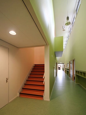 Binnen de school hebben we twee sferen gerealiseerd die door kleurgebruik worden ondersteund. Op de etage is de warme geborgen sfeer ondersteund met terra kleuren in de gangruimte. Op de begane grond hebben we de natuur- en creatieve sfeer ondersteund met lichtgroene kleuren in de gangruimte. Het verschil in kleurgebruik draagt bij aan een overzichtelijk gebouw en ondersteund de oriëntatie. In de centrale hal hebben we een levendige sfeer gecreëerd door toepassing van kleine gevelopeningen in primaire kleuren. De gevelopeningen zijn verspreid over de wand verdeeld en bevinden zich grotendeels op kindhoogte.