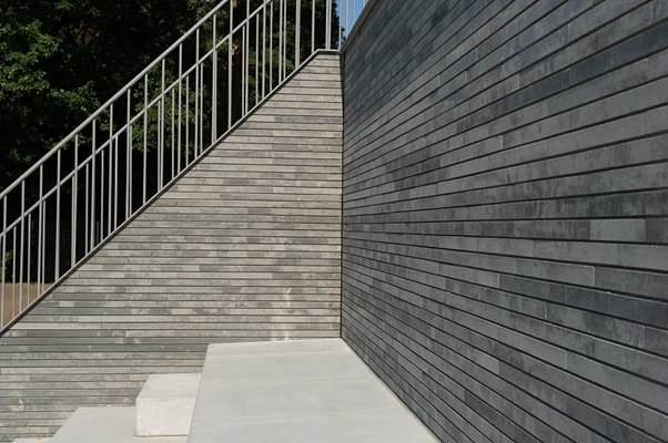 Het gebouw heeft een monolithisch karakter door de toepassing van langgerekte betonsteen. De stenen wisselen licht van kleur van lichtgrijs naar donkergrijs waardoor de plint van het gebouw een natuursteenachtige uitstraling krijgt met een levendige karakteristiek. Het logo van de vereniging is in dit metselwerk geïntegreerd. Omdat de langwerpige steen ook in de centrale gang is toegepast wordt het monoliete karakter van de plint versterkt.