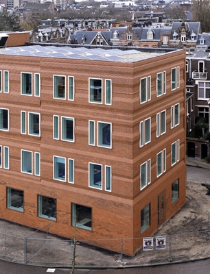 Dat golven werd mogelijk door de baksteensortering “Genua”, een over de hele lengte geschraagde baksteen in een homogeen oranjerood die Hagemeister speciaal voor dit project ontwikkelde. De golven in de gevels zorgen ervoor dat de homogeen gekleurde baksteensortering aan de gevels strakke slagschaduwen slaat, compleet met allerhande kleurnuances. Stootvoegen ontbreken, om de lineaire werking van de in wildverband gemetselde steen extra te onderstrepen. Ook de dunne lintvoegen, gelijmd met een dunbedmortel, onderstrepen de horizontaliteit van de gevels. De uit de voorgevel geponste ramen maken dat het baksteenprofiel tegen de zijkanten van de vensters stuikt; zo wordt de gevelprofilering nog scherper voelbaar.