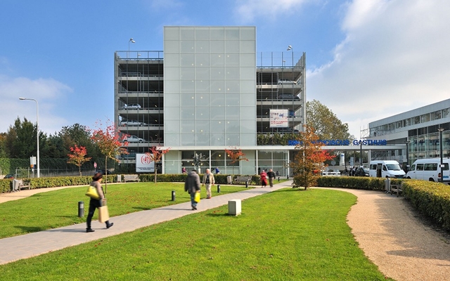 De parkeergarage is ontworpen voor 900 auto’s. Dit zijn bezoekersparkeerplaatsen, het personeel parkeert op het overgebleven terrein. De terreinindeling en de ingang van de parkeergarage zijn op elkaar afgestemd zodat eventuele wachtende auto’s voor de slagbomen hun eigen opstelstrook hebben, los van de doorgaande verkeersstromen. De drie slagbomen kunnen flexibel ingezet worden als in- of uitrit. Ook zijn er in de garage een ruim aantal mindervalide plaatsen gerealiseerd.
