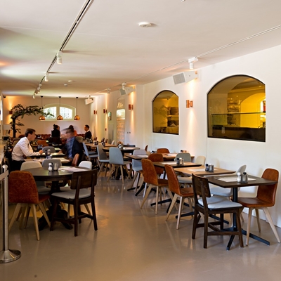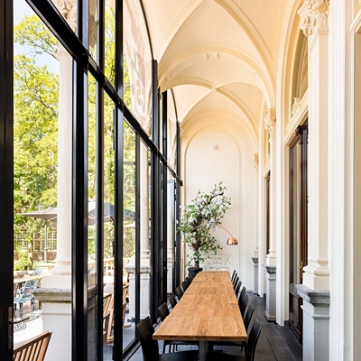 vinden. Het ontwerp voorziet in een duidelijke zonering in het gebouw voor publiek versus backstage. Logistieke processen en meervoudig gebruik zijn uitgangspunt voor de indeling op de diverse verdiepingen. De grote publieke ruimten komen op de makkelijkst bereikbare plekken in het gebouw. Het Grand café/restaurant strekt zich uit achter de voorgevel van het gebouw aan het park, en in de dichtgezette loggia’s, direct grenzend aan het buitenterras op de bel-etage. Het hart van het gebouw is de ontvangsthal op de bel-etage, centraal gelegen, de oorspronkelijke hoogte in ere hersteld en uitgerust met bar/informatiebalie.