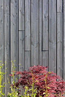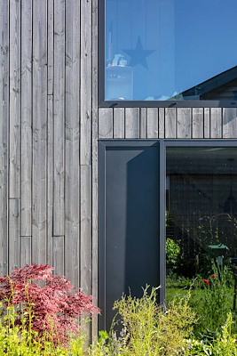 De mat zwart aluminium kozijnen liggen vlak in de gevel en creëren, zowel in materiaal als in kleur, een sterk contrast met de gevel van vergrijst Douglas houten delen. De houten delen zijn in drie verschillende breedtematen in vallende lengtes aangebracht en geeft de woning een warme natuurlijke uitstraling. Als uitzondering op de vlakke kozijnen ligt de entree van de woning juist verdiept in de gevel, om droog voor de voordeur te kunnen staan als het regent. De entree is op deze manier ook duidelijk herkenbaar.