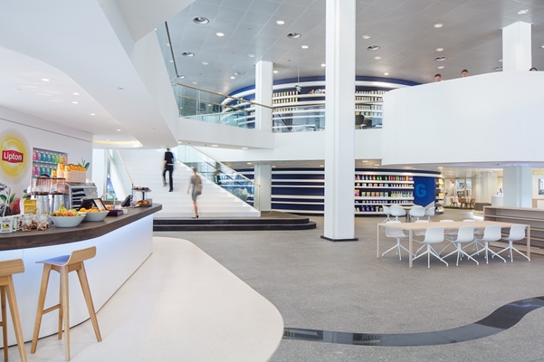 Op de begane grond en eerste verdieping zijn gesloten balustrades deels geopend en is er een nieuw eiland toegevoegd dat als het ware zweeft in het atrium. Het is één levendig werk- en ontspangebied waar verschillende merken beleefd kunnen worden. Er is een Tresemmé/Toni&Guy hairsalon, de Rexona fitness ruimte, een Knorr proefkeuken en ook een Lipton/Knorr/Hellmann’s bar met Ola Happiness Station, een Dove beautycenter, Ben&Jerry’s, de CiiC (3D virtual reality center) en een “Perfect Store”. De inzet van kleur, materiaal, graphics en textuur is net zo divers als de wereld van merken van Unilever.