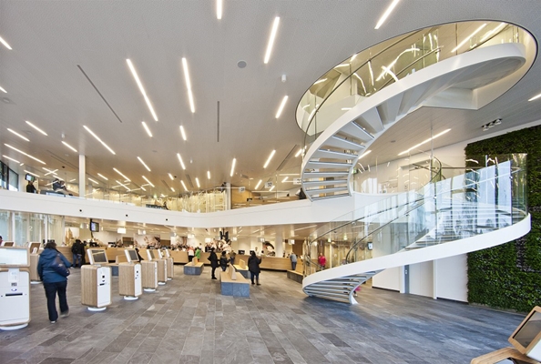 Vanaf de Zijlvest betreedt het publiek de nieuwe publiekshal, met balies, spreekkamers en de eerste, speciaal door Döll Architecten ontworpen, zelfservicepunten. Hiermee kunnen de bezoekers op uiteenlopende wijze worden bediend. De dubbelhoge hal is overzichtelijk, ruim en licht. Door de diagonale belijning in vloer en plafond wordt de bezoeker vanzelf naar de balies geleid. Een wenteltrap en een groenwand zijn de eyecatchers.