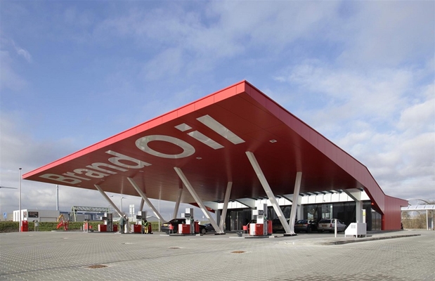 In de geschiedenis van de tankstations is de overkapping ontstaan ter bescherming van de pompbediende. Later is dit een belangrijk element gebleven ter beschutting van de zelftanker. Veelal is het tankgedeelte los gekoppeld of met een lichtstraat verbonden met de kiosk. Dit archetype van het tankstation hebben we gehandhaafd. Echter zijn de kiosk en tankdeel één geheel geworden. Het is als een vogel neergestreken in het landschap.