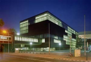 The University Library is an addition to the new university complex in the city of Utrecht. In any library, the storage of books and other light-sensitive items requires closed spaces, while the study space for students and researchers requires openness. Its organisation seeks to reconcile such a paradoxical requirement of a university library in an ingenious manner. The closed volumes of the depots are suspended like opaque clouds in the air, yet the open structure gives visitors an experience of spaciousness and freedom. Patterns of leaves are printed onto the glazed facades to create the sense of a building in the woods and to reduce sunlight penetration. From the main entrance, a wide staircase leads to the auditorium and exhibition space, and then continues further to the actual library area on the first level. Beyond the entrance gateways is the large lending area with the central desk. The void here rises to the very top of the building. Next to the void are the main staircases and elevators. These give access to all the reading rooms above and below. Next to the library, along the full length of the eastern side, a patio separates the library from the parking facilities and provides daylight on all sides. Located on the patio is the terrace of the reading cafe on the ground level. The parking facilities include a five-level garage and a separate bicycle shed.