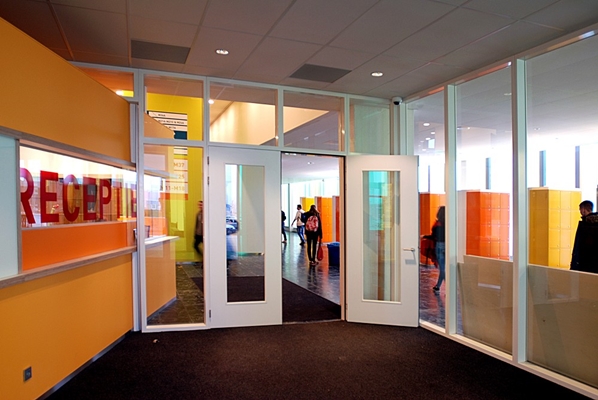 Om meer licht in het gebouw te halen, ontwierp dJGA hoge matglazen gevels grenzend aan het ontmoetingsplein. Voor extra daglicht werd het trappenhuis opgebroken; het onderste deel werd vervangen door een houten tribune waarop leerlingen kunnen zitten. Onder de tribune zijn toiletten, bergingen en spreekkamers ondergebracht. Nieuwe, witte plafonds, het gebruik van hout en heldere kleuren maken de lichtere beleving compleet.