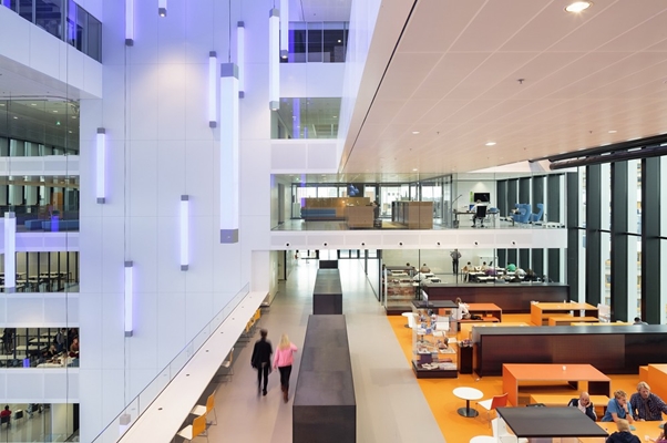 The foyer of the complex leads to the new ROC (regional training centre) Leiden via a wide stairway. The interior of the ROC, also designed by MVSA, is bright, calm and pleasant, and centred around a large atrium, with colours and iconography identifying the different areas. The levels directly above house offices, while the top three floors are occupied by a commercial hotel and a care hotel, and a restaurant with panoramic views. There is also a fitness club & wellness centre with a swimming pool.