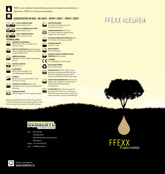 De bewezen eigenschappen van linoleum en vinyl, verbeterd met de laatste stand der techniek van productie en gecombineerd met een superieure manier van aanbrengen. Met gepaste trots presenteren wij de nieuwe manier van vloerbedekking: FFEXX, het eerste serieuze alternatief voor linoleum en vinyl.