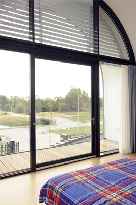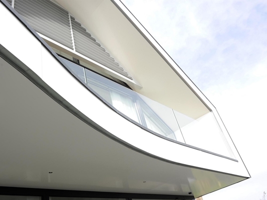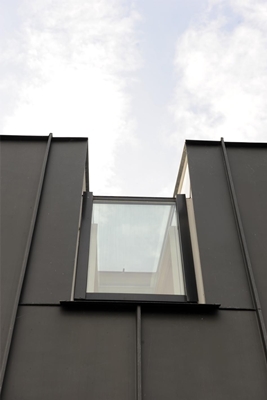 Een deels gebogen kapvorm en materialisatie geven de woning een excentriek uiterlijk. Er is met donkere kleuren is gewerkt voor gevels en dak, waarmee door het gebruik van veel glas ook witte interieur een rol speelt in het uiterlijk van de woning. Om het daglicht in de woning te reguleren op verschillende plekken aluminium lamellen toegepast.