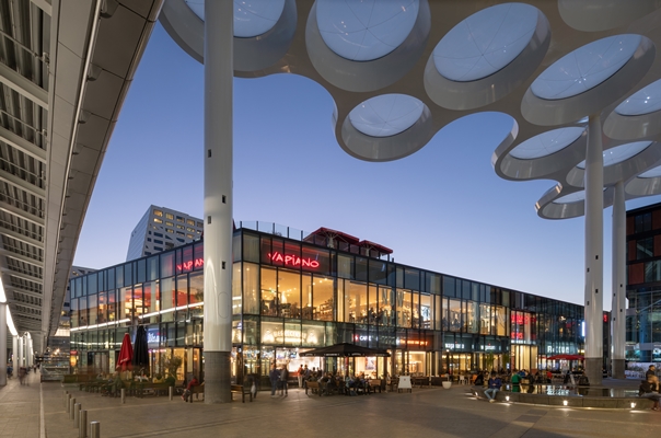 een multit-tenant gebouw ontworpen. Dit gebouw, beter bekend als ‘het paviljoen’, ligt naast het station Utrecht Centraal, aan het nieuwe Stationsplein-Oost en is gebouwd bóvenop spoor één, twee en drie van het Centraal Station. Diverse winkels en horeca die gericht zijn op de ov-reiziger hebben er inmiddels hun intrek genomen. Het gebouw biedt een van de fraaiste uitzichten over de sporen en heeft ook een dakterras dat ook uitzicht biedt over het altijd levendige stationsplein.