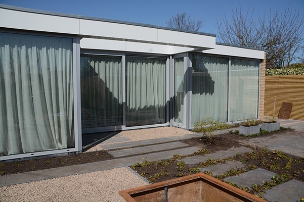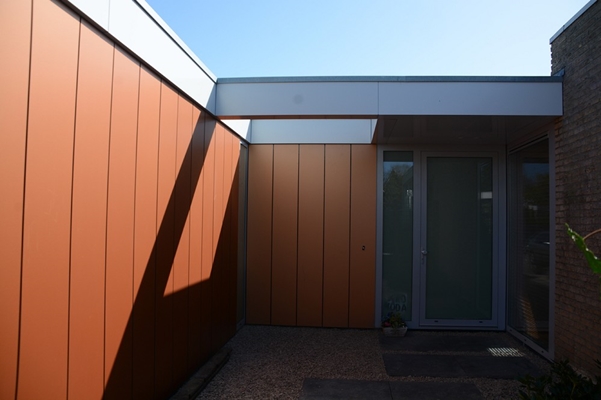 Met oog op de toekomst wilden de opdrachtgevers een onderhoudsvrije woning. Door de houten kozijnen door aluminium en de houten boeidelen door ALUCOBOND® te vervangen en de gevel te bekleden met smalle stroken Trespa Copper Yellow kán de woning nu zonder onderhoud toe.