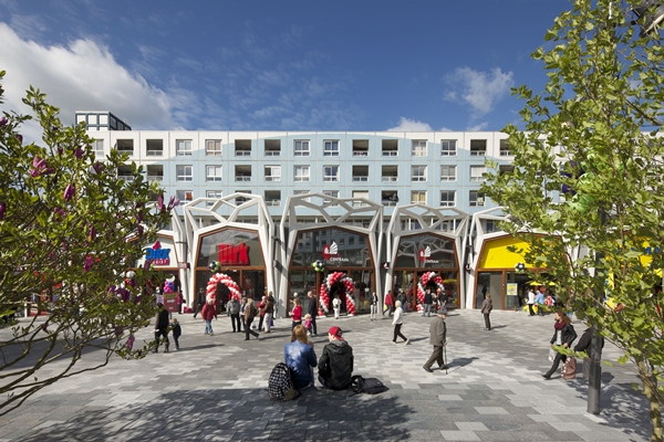 De architectuur met rijk gedecoreerde winkelpuien als opstaande ‘kragen’ van stralend wit prefabbeton geven het plein het ‘eigen’ karakter. Bomen en terrassen, op het plein zorgen voor een natuurlijke verblijfskwaliteit. Prachtige natuurstenen afwerking van het plein geven het geheel een on-Nederlands niveau.