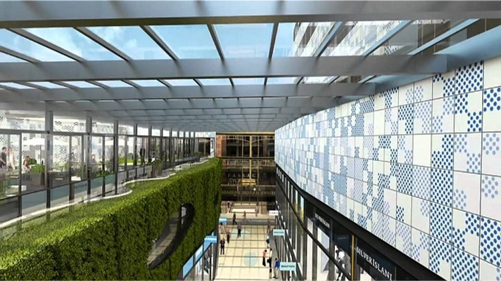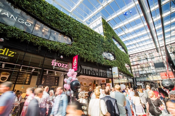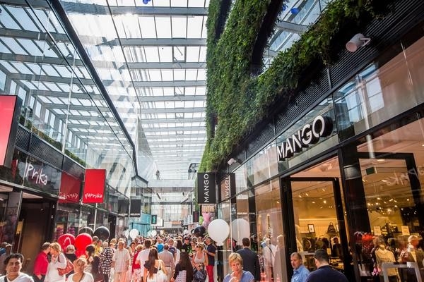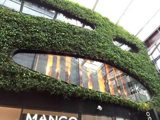 De nieuwe overdekte winkelstraat heeft een aantal opvallende kenmerken meegekregen, waarbij de groene gevel direct in het oog springt. Deze op maat gemaakt verticale tuin rondom de ellips-vormige ramen is een goede demonstratie van de flexibiliteit van het