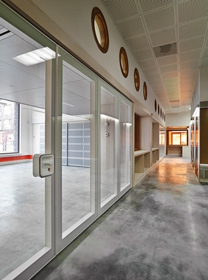De lespleinen in de brede school Houthaven te Amsterdam zijn op diverse wijzen in te delen door de toepassing van mobiele wanden. De architectuur maakt het mogelijk diverse activiteiten te ontwikkelen voor-, tijdens- en na de officiële lesuren en beoogt tevens samenwerking tussen de verschillende gebruikers te stimuleren. Voor de mobiele wanden in de gangen is een bewuste keuze gemaakt voor Visio 100 Elite glazen wanden (Rw = 42 dB) voor voldoende daglichttoetreding. Tussen de lokalen zijn Espero Sonico 110 (Rw = 50dB) wanden geplaatst.
