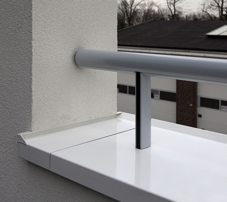 De architect heeft zich bij zijn keuze laten adviseren door de aannemer. De balusters zijn zodanig in de kap verwerkt dat er geen lekkage kan ontstaan. Door de blinde bevestiging ontstaat bovendien een mooi strak geheel. De speciale eindstukken, die Roval Aluminium vervaardigde, zorgen voor een waterdichte aansluiting op het stucwerk.