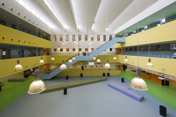 Het gebouw huisvest twee verschillende scholen onder één dak en wordt gekenmerkt door de vele duurzame en energiebesparende maatregelen. Opdrachtgever is Hevo. Het plan omvat ca. 9.900 m² onderwijs dat in een U-vorm in drie vrij indeelbare bouwlagen georganiseerd is rondom een centraal atrium. Het gevelbeeld heeft twee identiteiten: een verticale en een horizontale verdeling van oranje-rode metselwerkvlakken, gecombineerd met in kleur verlopende metselwerksorteringen in geel en zwart. De beide principes geven beide scholen een eigen gezicht en maken het complex tot één geheel. De kleurstelling en het meubelontwerp in het atrium zijn tot stand gekomen in samenwerking met het impresariaat Kunst en Bedrijf-Gabi Prechtl en kunstenaar Studio Ramin Visch. Projectteam: Bertold van Burg, Dirk-Jan van Doorn, Hans Roest en Sander Ros - See more at: http://www.roosros.nl/projecten/124/dr.-mollercollege-en-walewyc.html#sthash.AyJmHU7r.dpuf