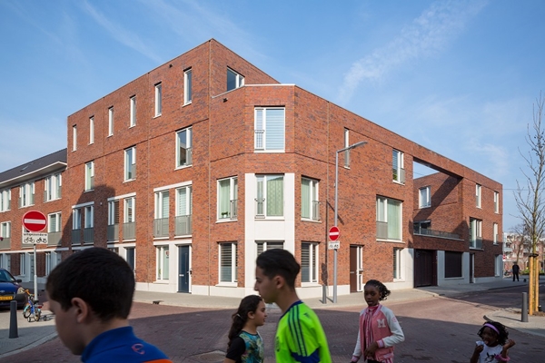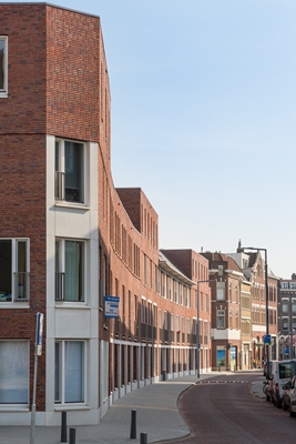 Er is veel aandacht besteed aan de uitwerking van de begane grond en de straathoeken, passend bij de karakteristieke 19e eeuwse bebouwing in de omgeving. De gevels zijn in verschillende metselwerkverbanden uitgevoerd, met verbijzonderingen in witte prefab beton.
