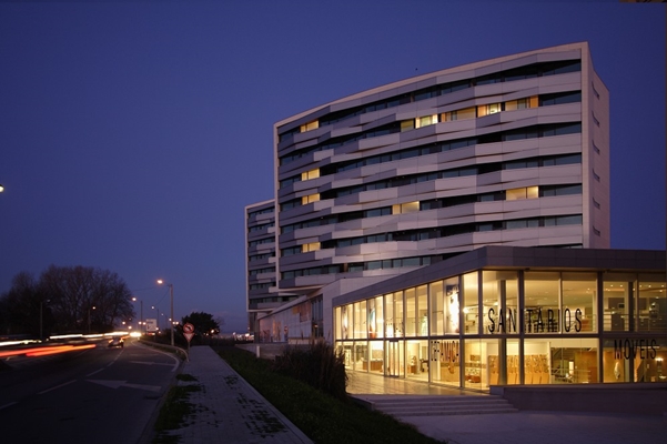 This unconventional geometry requires an optimal structural solution to allow maximum flexibility in terms of planning the interior. In order to achieve this goal and give the impression of more open space, only four pillars appear at each side of the elevator. The double external skin on the twin blocks exterior determines their appearance. The first outer layer comprises extensive floor to ceiling windows extending the perceived space towards the balconies. The metallic skin made of ALUCOBOND