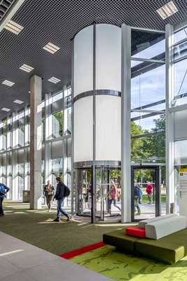 die zo ontworpen is dat deze een mooi geheel vormt met de gevel. De kapcontructie van de tourniquetdeur is bijna 6 meter hoog en is voorzien van melkglas en verlichting over de gehele hoogte.