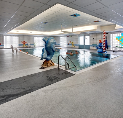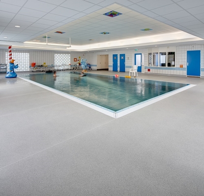 Rondom zwembaden wordt vaak gewerkt met tegels. Tegels zijn glad en na enkele jaren ontstaat er kalk in de groeven. De Safetred heeft een hoge slipweerstand en is eenvoudig in onderhoud. De vloeren rondom het bad zijn geïnstalleerd met Safetred Universal en Safetred Aqua. Door middel van kleurgebruik is er een duidelijk pad aangegeven van de douche naar het zwembad. De wanden in de douche, in de kleedkamers, in de gangen en de deuren zijn afgewerkt met ProtectWall. Deze zijn uitgesneden als golven om de bewoners ook in de kleedkamer en gangen duidelijk te laten voelen dat ze zich in de zwembadomgeving bevinden.