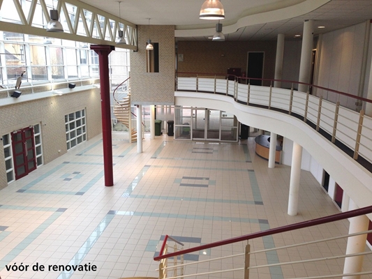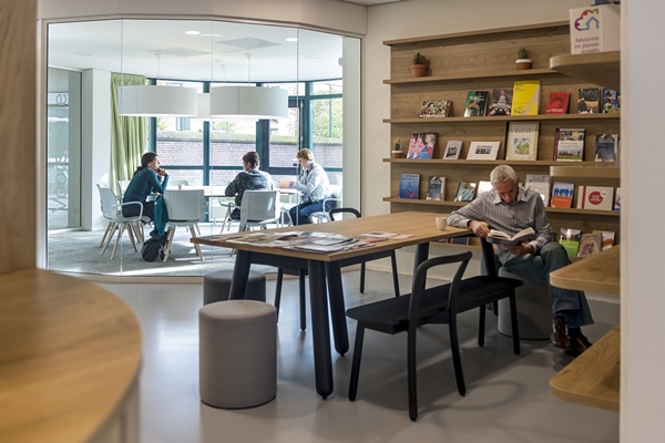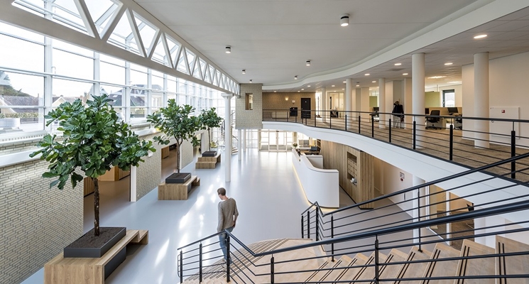 Het groen van buiten hebben we naar binnen gehaald. Vertaald in kleuren en materialen en soms letterlijk zoals in de ruime entreehal. Hier staan drie grote bomen, de ruimte wordt een kas waarin mensen elkaar ontmoeten. Tijdens een gesprek met één van de medewerkers vertelde ze over haar nieuwe werkplek: “Ik voel me weer serieus genomen. We waren een beetje weggestopt, maar ik sta nu weer in the picture.”