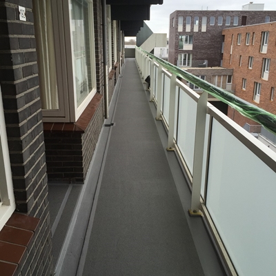 De balkons zijn voorzien van het Triflex BCS systeem. Een coating die zorgt voor bescherming en bovendien is aan te brengen in diverse kleurvariaties. Het geheel werd afgewerkt met Triflex Micro Chips. Een decoratieve coating die zorgt voor grip, toegepast in een zachte grijs tint. Modern en mooi in samenhang met de galerijen.