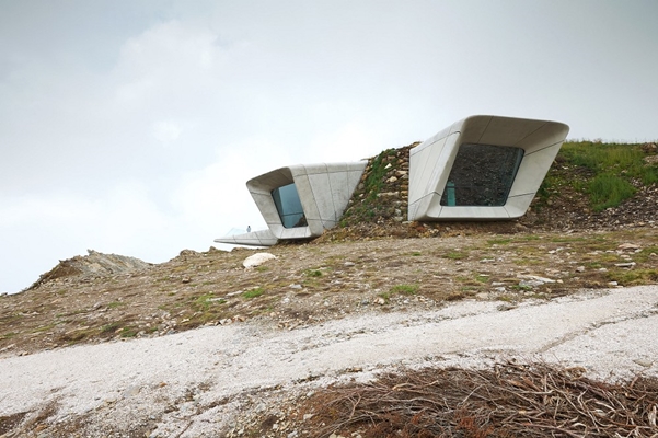 . Aan de rand van het rotsplateau steken slechts vier openingen als verrekijkers uit de heuvel. Een van deze openingen is de ingang van het museum. Door de andere heeft men een schitterend uitzicht op het unieke berglandschap. De voor het architectenbureau karakteristieke vloeiende vormen worden in het interieur voortgezet vanaf de hoger gelegen ingang tot de panoramavensters. Voor het bijna geheel onder de grond liggende gebouw is donkergrijs plaatselijk beton gebruikt. De gangen lijken op bochtige bergwegen of kronkelige spelonken. Het vlak met het oppervlak geïnstalleerde Gira schakelaarprogramma E22 van roestvast staal harmonieert met de onherbergzame omgeving.