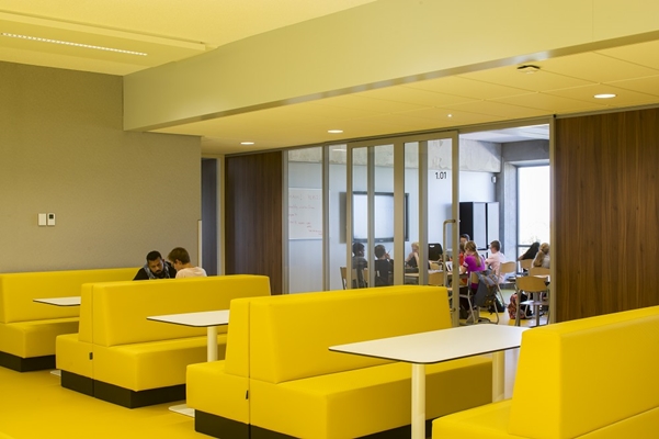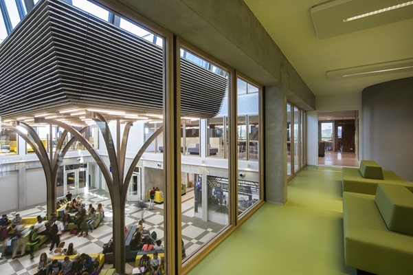 Voor deze school is gekozen voor een integraal systeem waarmee wordt geventileerd (koelen en verwarmen) en waar de verlichting in is opgenomen. Ieder lokaal of onderwijsplein is voorzien van twee of meerdere elementen. Koeling via een klimaatplafond werkt compleet anders. Een klimaatplafond werkt namelijk op basis van radiatie en convectie. De problemen die conventionele systemen met zich meebrengen, bijvoorbeeld geluidsoverlast en tochtverschijnselen, worden door deze methode uitgesloten. Het klimaatplafond combineert eenvoudig de systeemeigenschappen die in een ruimte nodig zijn ter bevordering van het thermisch en akoestisch comfort. Bij het Hybride klimaatplafond wordt er gebruik gemaakt van een conventioneel klimaatplafond. Dit plafond is opgebouwd uit een geperforeerd aluminium paneel en voorzien van koperen leidingen waardoor het energiedragende medium water stroomt. Op deze panelen wordt een akoestische mat aangebracht om voldoende demping te genereren. Tevens zijn er dus ook armaturen opgenomen in het plafondeiland.